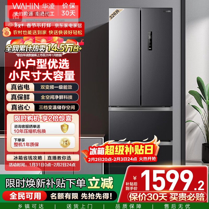 华凌美的出品326L法式多门冰箱一级能效双变频风冷无霜家用电冰箱节能净味冰箱BCD-326WFPH国家补贴¥