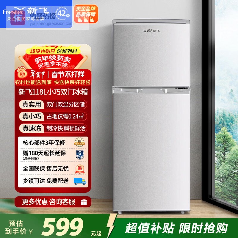 新飞 (Frestec)118L两门分区存储迷你环保节能省电小巧机身冰箱 BCD-118L2D¥