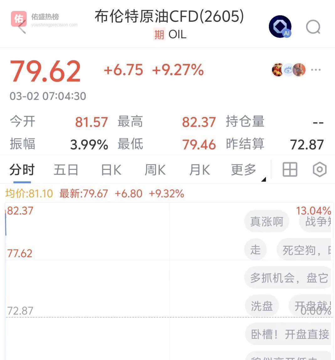 北京时间3月2日早晨7点,全球期货市场开盘。布伦特原油期货价格瞬间跳涨13%,最高触及每桶82美元;WTI原油期货也跃升至75.33美元/桶。截至发稿时,布伦特原油价格报79.62美元/桶,涨幅仍高达9.27%。现货黄金同样高开高走,盘中最高触及5373.49美元/盎司,截至发稿报5341美元/盎司,上涨1.21%。现货白银报94美元/盎司,COMEX白银期货涨幅更是达到7.77%。