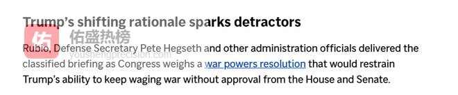 3月2日,美国务卿鲁比奥在国会向参众两院领导层及相关议员说明对伊朗军事行动的目标与进展。与此同时,民主党领导层已向议员发出"党鞭通知",推动本周稍晚就该决议表决并要求成员投赞成票,少数共和党议员也释放出跨党派支持信号,参议院最快可能在本周推进相关程序。