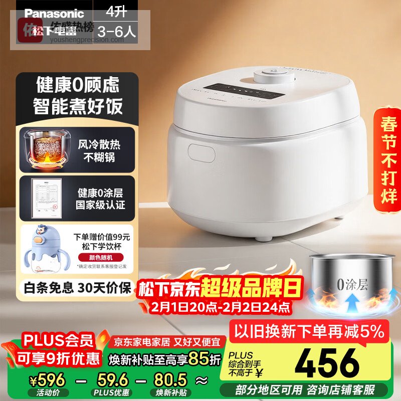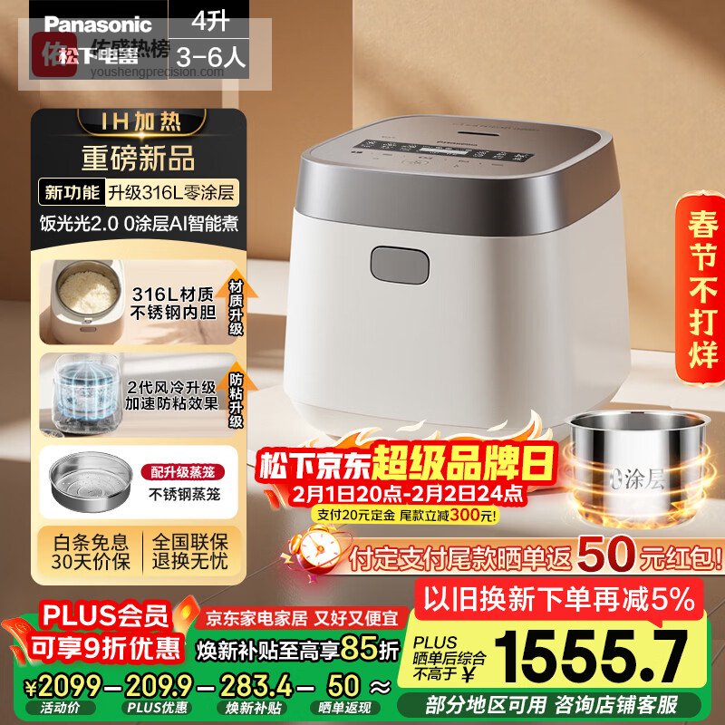 松下(Panasonic)【国家补贴】饭光光2.0电饭煲0涂层IH加热家用电饭锅4-5人无涂层母婴级不锈钢4升一级能效 HNS152¥