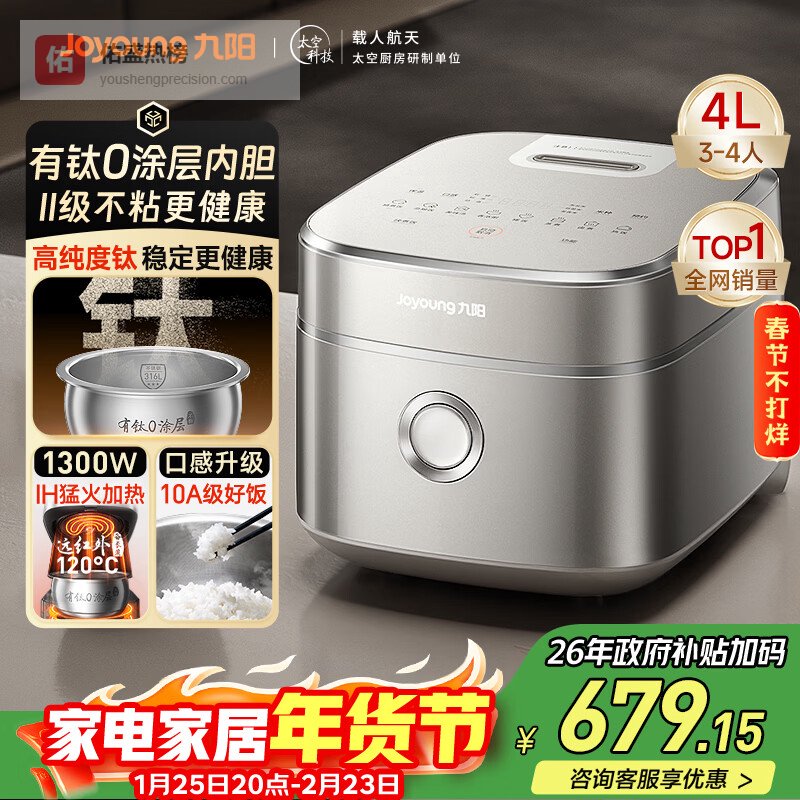 九阳(Joyoung)【升级高纯钛】不粘0涂层4L家用3-4人无涂层IH电饭煲电饭锅316L不锈钢内胆远红外国家补贴 40N1U¥