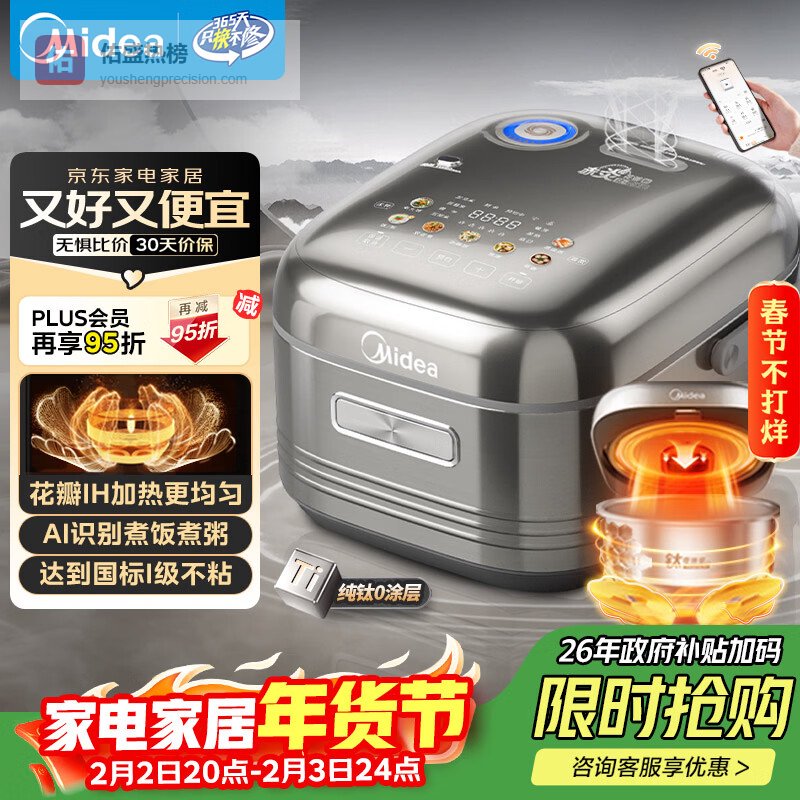 美的(Midea)【年货好物】纯钛0涂层电饭锅防粘4L无涂层花瓣IH1.0电饭煲4-5人家用智能多功能MB-HS412¥