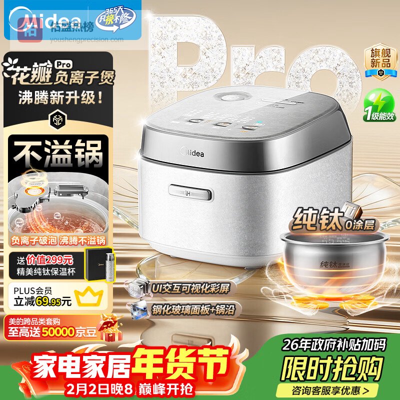 美的(Midea)花瓣Pro 2.0IH加热电饭煲电饭锅3-4人纯钛0涂层家用舒胃柴火饭钢化玻璃电煮锅40HB9T一级能效年货¥