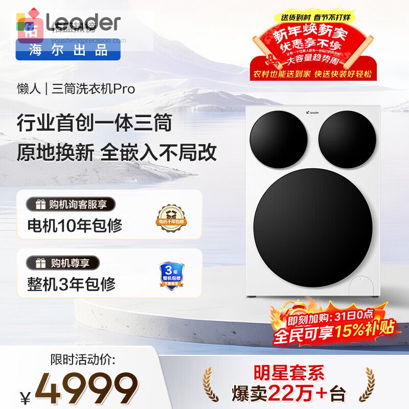【京东自营】统帅海尔出品懒人三筒洗衣机Pro内衣洗全自动直驱三桶换新补贴12.5公斤林高远XQGL1¥