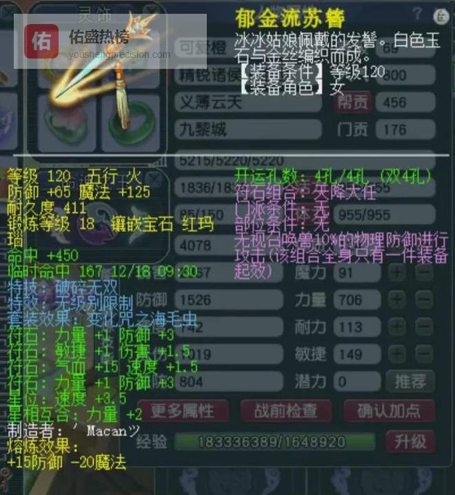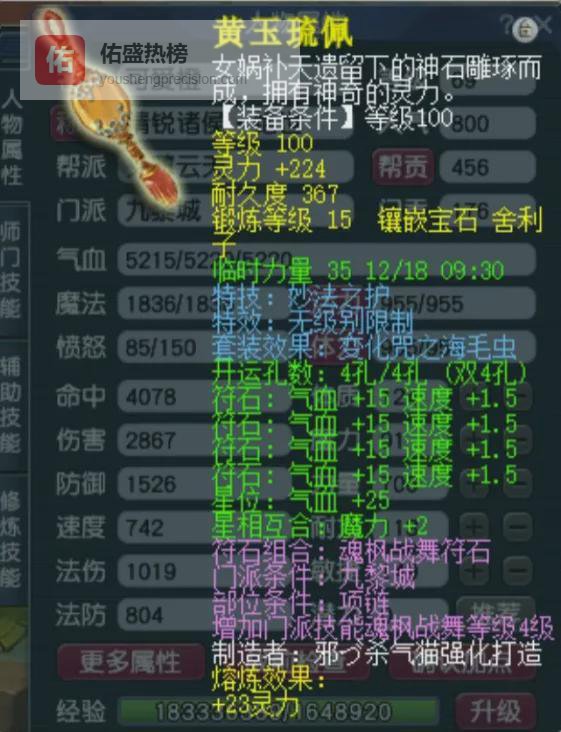 100级无级别妙法之护项链,15锻 熔炼总灵247。搭配玉魄的奇袭特技,为单体目标增加法防抗性。