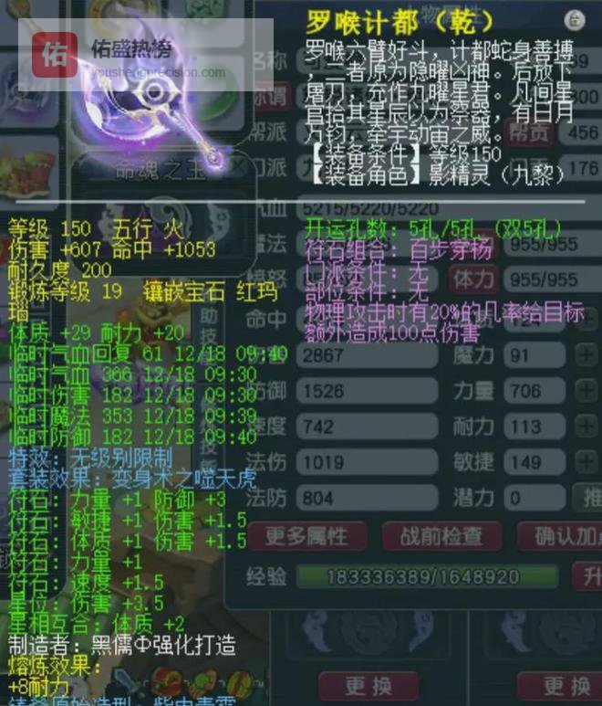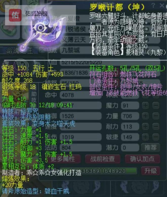 150级单加36力量的无级别修罗咒右斧(原武器斧头),18锻红玛瑙综合伤害982。距离千伤属性仅一步之遥,全服纯伤武器榜前五级别的存在。