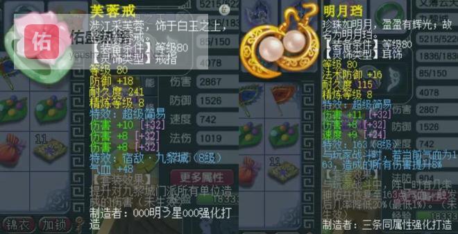 前排灵饰是80级超级简易带五伤害一速度。戒指上排防御18爆2,下排伤害共26爆2;耳饰上排法防16国标,下排伤害共19爆3、速度9爆2。