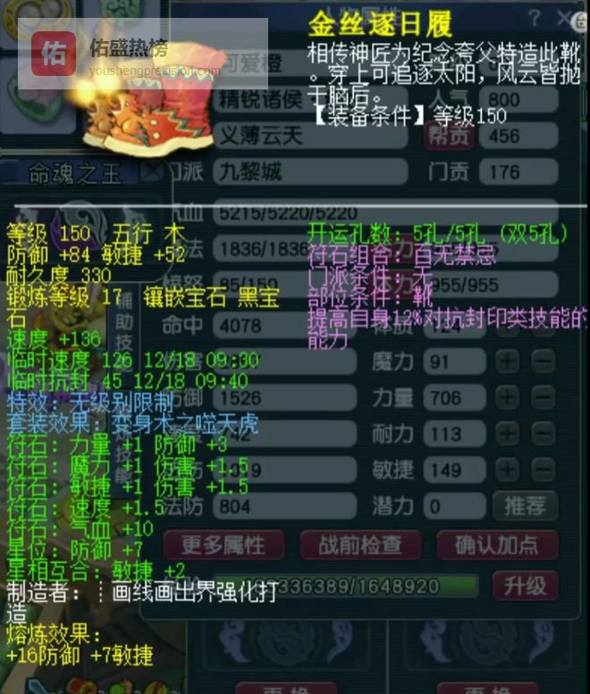 150级无级别鞋子,熔炼后防御100、敏捷59。镶嵌17锻黑宝石,极致属性只为抢到一速出手的优势。