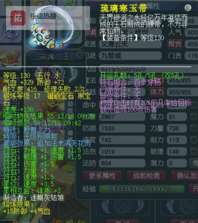 130级无级别野兽腰带,熔炼后气血333、防御87,镶嵌17锻黑宝石。开局先给自己来一发野兽之力,打对手的召唤兽如砍瓜切菜般简单。