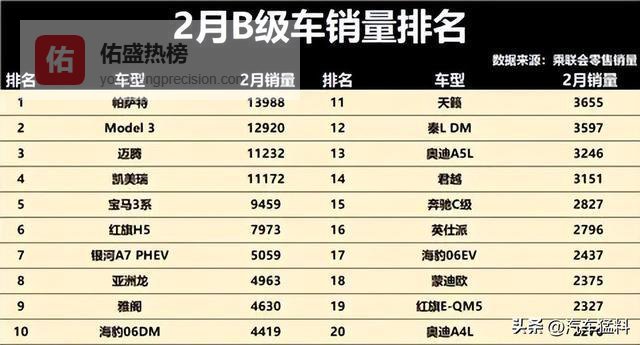 B级车2月战报:燃油车“回光返照”凯美瑞、迈腾过万