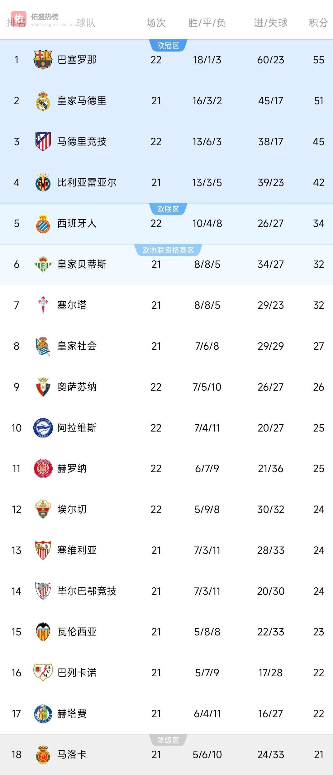 一夜之间,西甲积分榜的形势变得清晰起来。巴萨以55分巩固了榜首位置,皇马少赛一场积51分紧随其后。而马竞和比利亚雷亚尔(42分),与前两名的分差拉大到了10分和13分。传统的三强争霸,在这个夜晚之后,似乎已经演变成了巴萨与皇马的二人转。