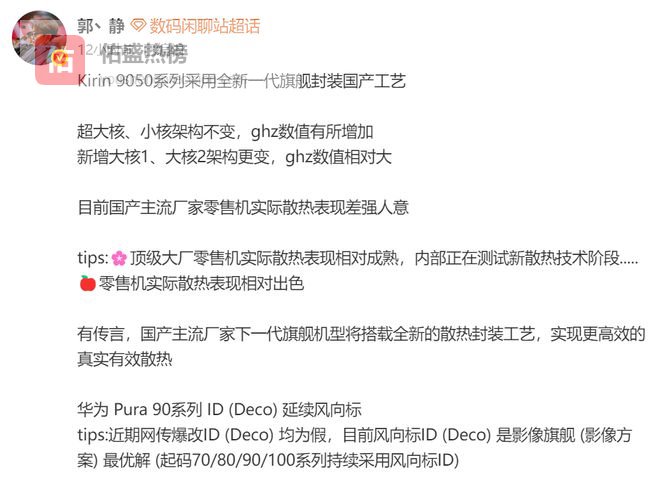 据爆料信息,Kirin 9050系列采用全新一代旗舰封装国产工艺,在核心配置上,超大核和小核的架构保持不变,但频率数值有所增加。