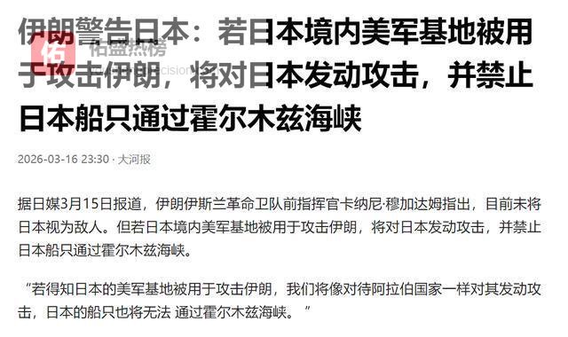 面对此,伊朗直接对日本发出警告,当地时间3月15日,伊朗伊斯兰教革命卫队前指挥官指出,目前伊朗并没有把日本当做敌人 ,如果高市当局把日本境内的美军基地拿来攻击伊朗,那么伊朗将对日本发动攻击,并且禁止日本船只通过霍尔木兹海峡。