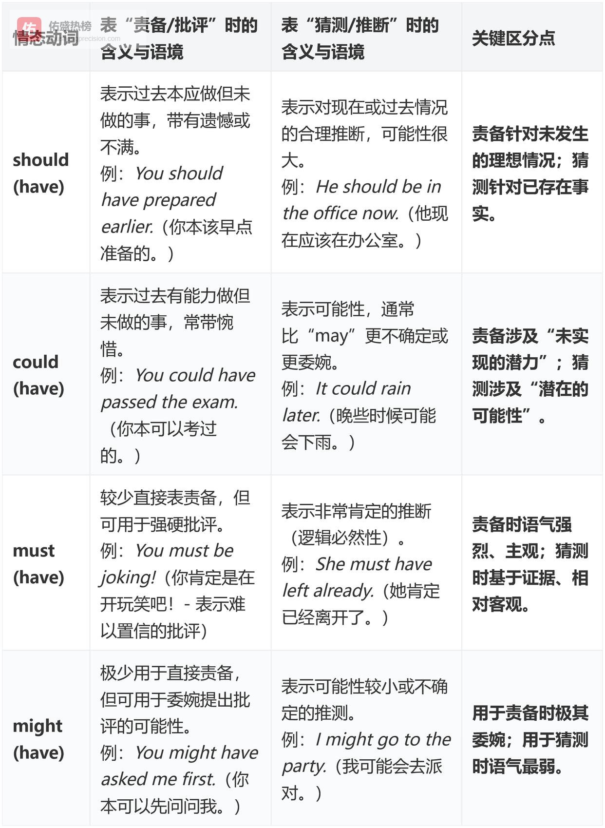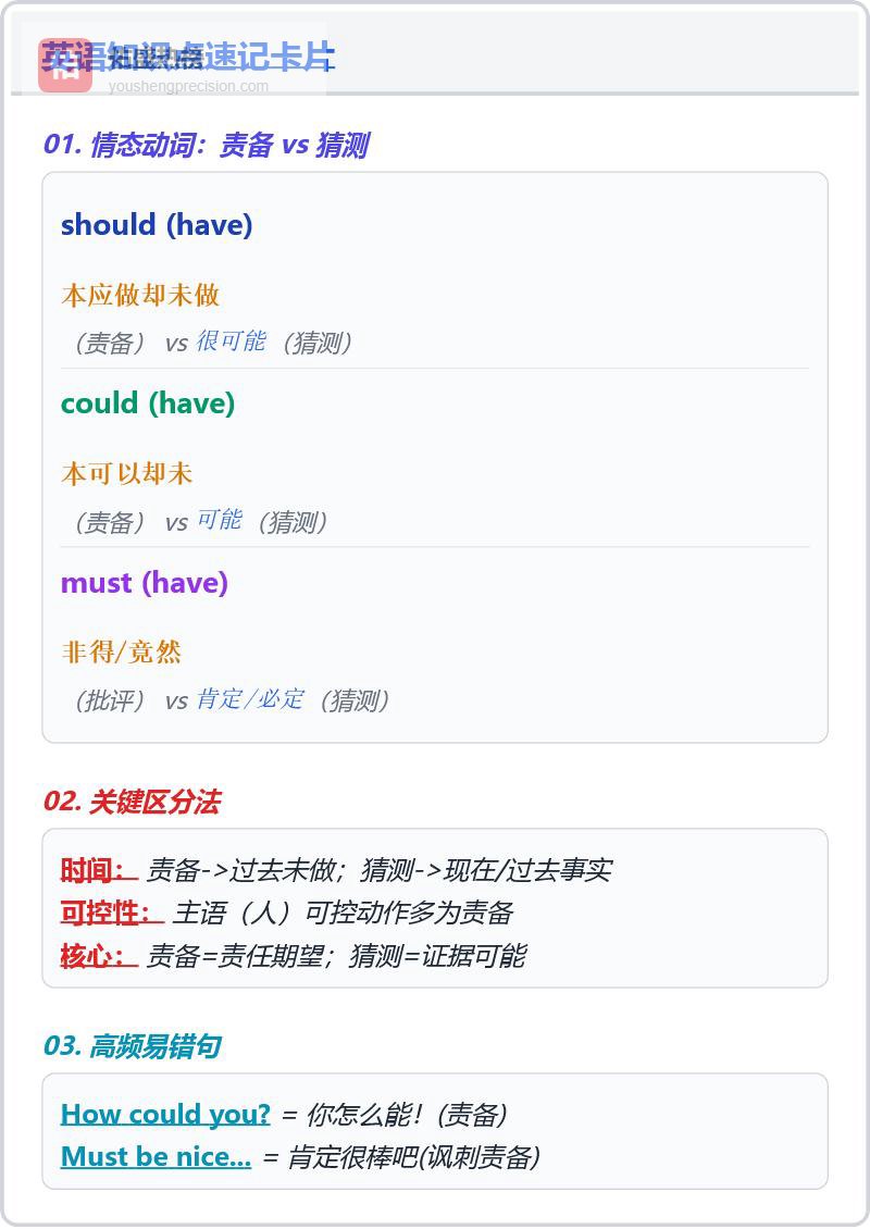 【重点】should have/could have 是“责备”与“猜测”的重灾区。区分关键在于判断句子是指向一个“未发生的替代行动”(责备),还是一个“可能存在的事实”(猜测)。