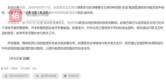 据央视新闻报道,3月17日,欧盟委员会主席冯德莱恩与欧洲理事会主席科斯塔发表联合声明,表示欧盟正在就修复“友谊”输油管道的受损设施,以及恢复石油供应的问题,与各方密集沟通。