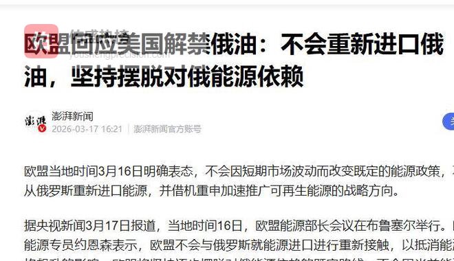 欧盟委员会主席冯德莱恩之前也明确反对放弃长期能源战略,直言重新依赖相关国家化石燃料是“战略性错误”,会让欧盟更依赖、更脆弱。