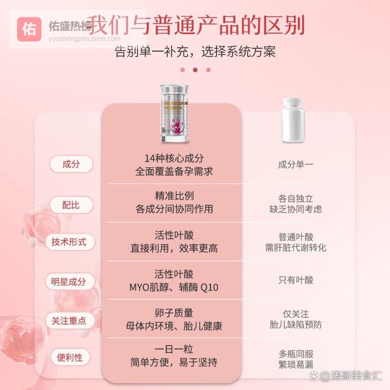 1.配方逻辑上,黄余堂打破了“一把抓”的粗放模式,让每种营养素都在备孕链条上找到精准发力点:肌醇从源头调节内分泌环境,辅酶Q10为卵泡发育持续供能,活性叶酸全程守护遗传物质合成,矿物质则负责加固母体基础健康。四重路径环环相扣,让调理效果落到实處。