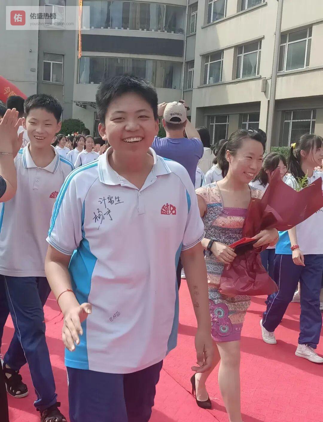 红地毯、鲜花与鞠躬——孩子们用最朴素的方式向老师致敬。三年里,老师批改过的作业堆成小山,也陪他们熬过无数个深夜。此刻,“谢谢”两个字被献花替他们说出,花香混着泪光,成了最动人的告白。