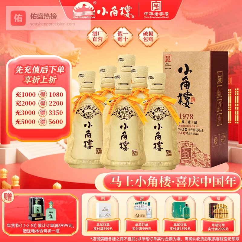 小角楼1978 52度浓香型白酒口粮酒 四川白酒礼盒装固态纯粮粮食口粮酒 52%vol 500mL 6瓶 升级版带3礼品袋¥