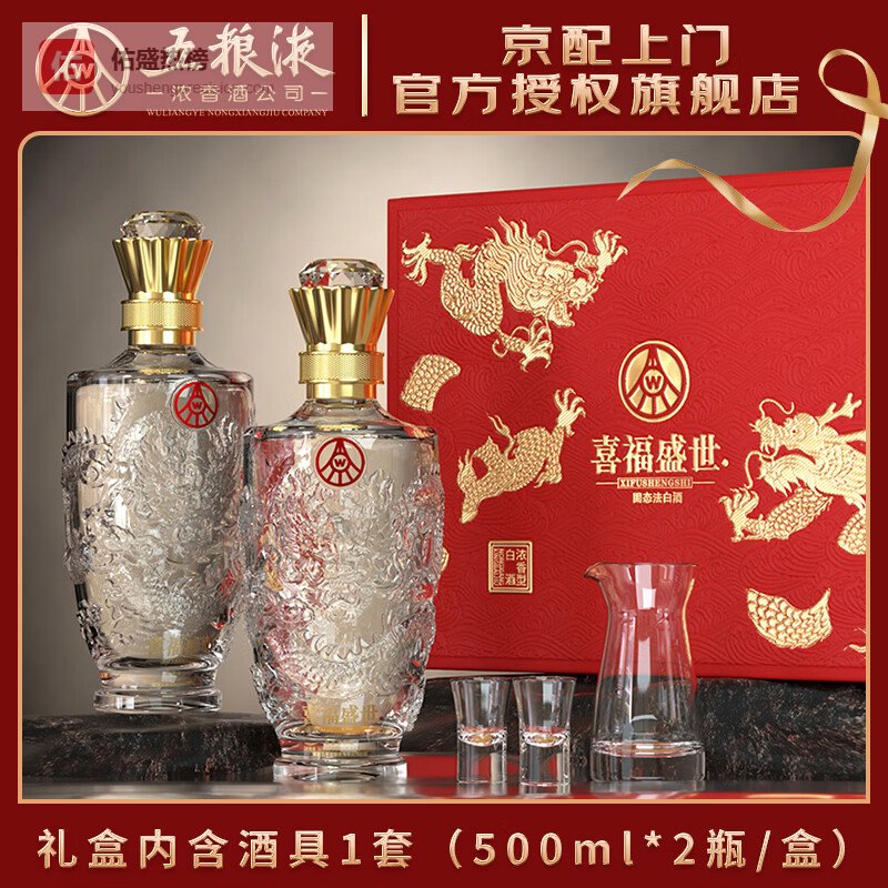 五粮浓香五粮液股份出品 官方授权 浓香型优级白酒 喜福盛世 52度 500mL 2瓶 礼盒装(内含酒具)¥
