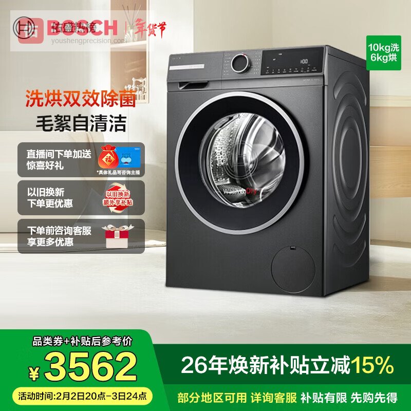 【品牌直营】博世4系星云灰10KG洗烘一体机全自动家用滚筒洗衣机热风除菌羊毛洗护毛絮自清洁强力去渍除¥