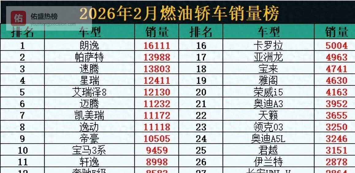 你敢信吗? 2026年开年第一个完整销售月,中国燃油轿车市场就上演了一出“大地震”。大众朗逸、帕萨特、速腾三兄弟,直接包揽了销量榜前三名。 而曾经的家轿之王日产轩逸,连前十都没挤进去。