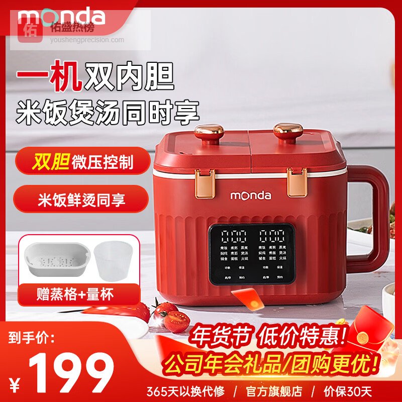 四、蒙达▶ 双胆设计:拥有两个独立的内胆,可以同时烹饪不同的食物,比如一边煮米饭,一边炖汤,或者一锅涮火锅另一锅煮菜,满足一家人不同口味的需求。