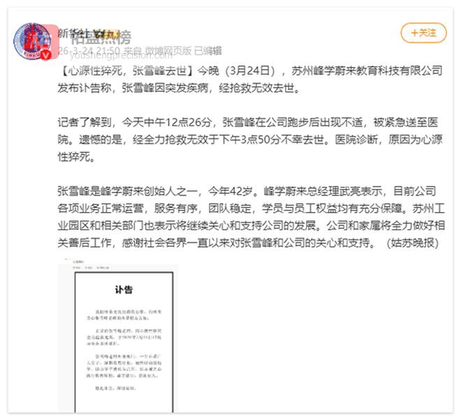 据新华社报道,2026年3月24日中午,教育界知名人士张雪峰在公司跑完步后感到不适,被紧急送往医院。抢救持续了三个多小时,最终没能挽回这条41岁的生命。