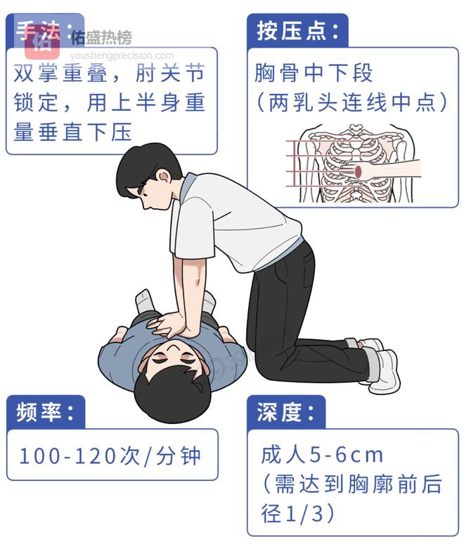 心肺复苏以30次胸外按压2次人工呼吸为一个循环,每完成5个循环,建议更换按压者,疲劳会降低按压效率。