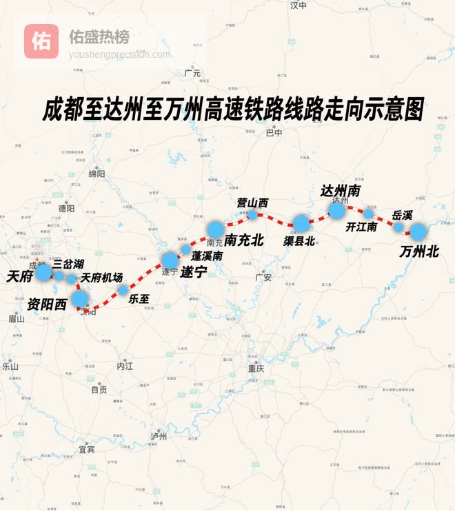 成达万高铁是我国“八纵八横”高铁网沿江通道的重要组成部分。线路西起四川省成都市天府站,途经四川省资阳市、遂宁市、南充市、达州市及重庆市开州区、万州区,接入既有郑渝高铁万州北站,对四川省打通直达长三角、京津冀经济区高速铁路大通道,构建轨道上的成渝地区双城经济圈具有重要意义。