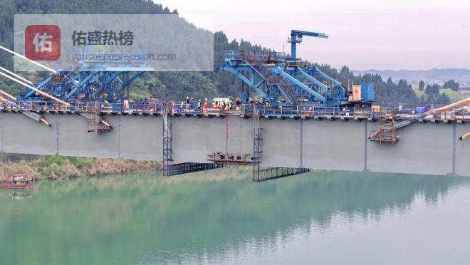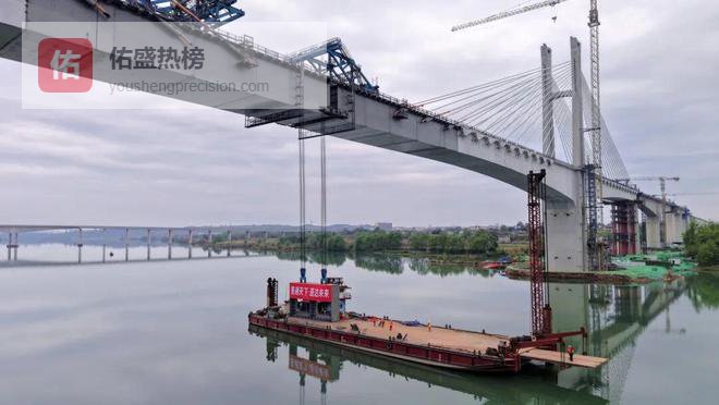 全桥钢箱梁共11个节段,最后吊装的钢箱梁长2米、宽14.2米、高6.5米,总重达28.2吨。由于大桥横跨嘉陵江,施工团队创新采用“浮运 桥面吊装”方案,先将钢箱梁通过浮箱从码头运输至江心指定位置,再运用280吨桥面吊机进行精准提升。
