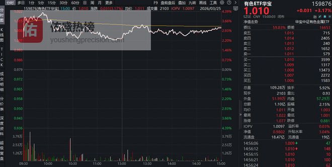 或由于中东地缘事件出现关键拐点信号,周三(3月25日)现货黄金直线拉升冲上4500美元,全面覆盖黄金、稀土、铜铝等有色金属行业龙头的有色ETF华宝(159876)场内涨幅最高上探4.29%,收涨3.17%,一举收复5日均线和半年线,值得一提的是,资金加速低位布局,该ETF全天获资金净申购360万份。