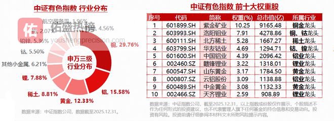 风险提示:有色ETF华宝被动跟踪中证有色金属指数,该指数基日为2013.12.31,发布于2015.7.13,指数近5个完整年度的涨跌幅为:2021年,35.89%;2022年,-19.22%;2023年,-10.43%;2024年,2.96%;2025年,91.67%,指数成份股构成根据该指数编制规则适时调整,其回测历史业绩不预示指数未来表现。本文中指数成份股仅作展示,个股描述不作为任何形式的投资建议,也不代表管理人旗下任何基金的持仓信息和交易动向。基金管理人评估的该基金风险等级为R3-中风险,适宜平衡型(C3)及以上的投资者,适当性匹配意见请以销售机构为准。任何在本文出现的信息(包括但不限于个股、评论、预测、图表、指标、理论、任何形式的表述等)均只作为参考,投资人须对任何自主决定的投资行为负责。另,本文中的任何观点、分析及预测不构成对阅读者任何形式的投资建议,亦不对因使用本文内容所引发的直接或间接损失负任何责任。基金投资有风险,基金的过往业绩并不代表其未来表现,基金管理人管理的其他基金的业绩并不构成基金业绩表现的保证,基金投资须谨慎。