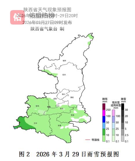 3月29日:关中西部、陕南大部有小雨(0~10毫米),其中陕南西部局地有中雨(10~20毫米),宝鸡西部局地、秦岭山区西段部分地方有雨夹雪或小到中雪(0~5毫米)(图2)。日平均气温关中西部、陕南西部下降4℃左右。陕北西部及北部部分地方有霜冻(图4)。