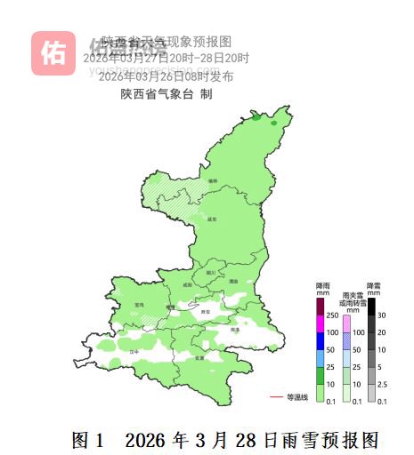 受高空槽东移影响,预计3月27日夜间至30日我省有一次大范围雨雪降温吹风天气过程。全省大部有小雨,秦岭山区东段局地、巴山西段局地有中雨,陕北西部局地、关中西部局地、秦岭山区西段有雨夹雪或小到中雪,局地(西安市周至县、宝鸡市太白县)有大雪。