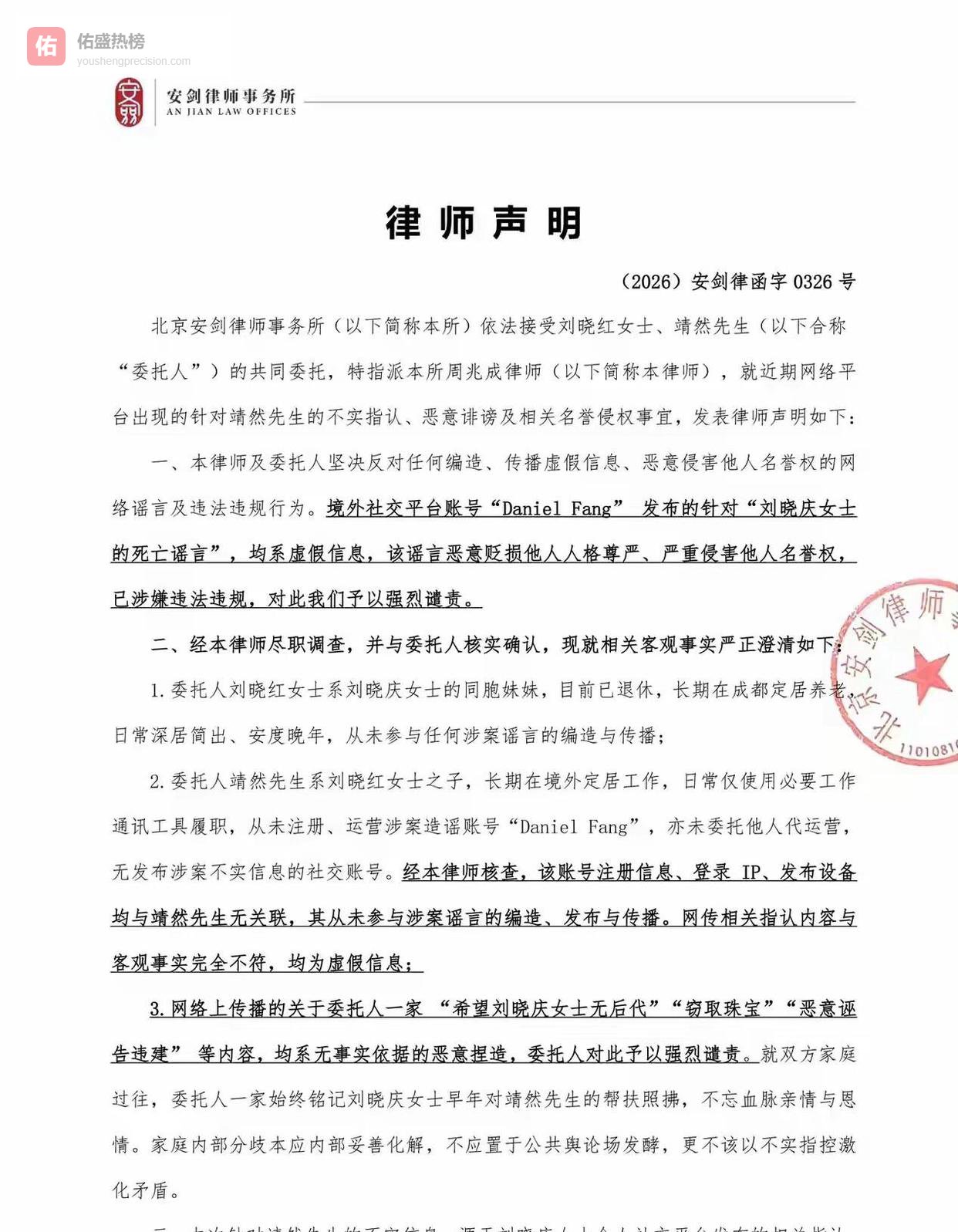 3月26日,刘晓庆的妹妹刘晓红和外甥靖然委托北京安剑律师事务所发布了一份律师声明。 声明指出,经核查,发布谣言的账号“Daniel Fang”的注册信息、登录IP和发布设备均与靖然无关,靖然从未注册或运营该账号。 声明同时澄清,网络上关于刘晓红一家“希望刘晓庆无后代”、“窃取珠宝”、“恶意诬告违建”等指控均为捏造。 声明最后呼吁刘晓庆“以亲情为重,厘清真相、消除影响”。
