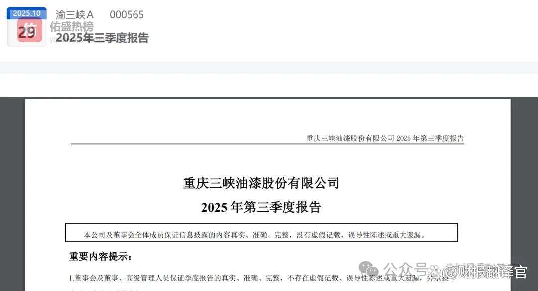 这张餐桌,名叫渝三峡A。案卷初览,平淡无奇:一家老牌涂料公司,三季度赚了1649.16万元,同比增长9.69%,还算稳健。