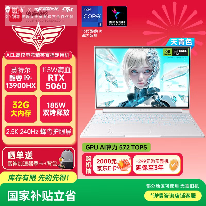 雷神猎刃S 【RTX5060】16英寸学生游戏笔记本电脑(i9-13900HX 32G1T 240Hz天青色)国家政府补贴¥