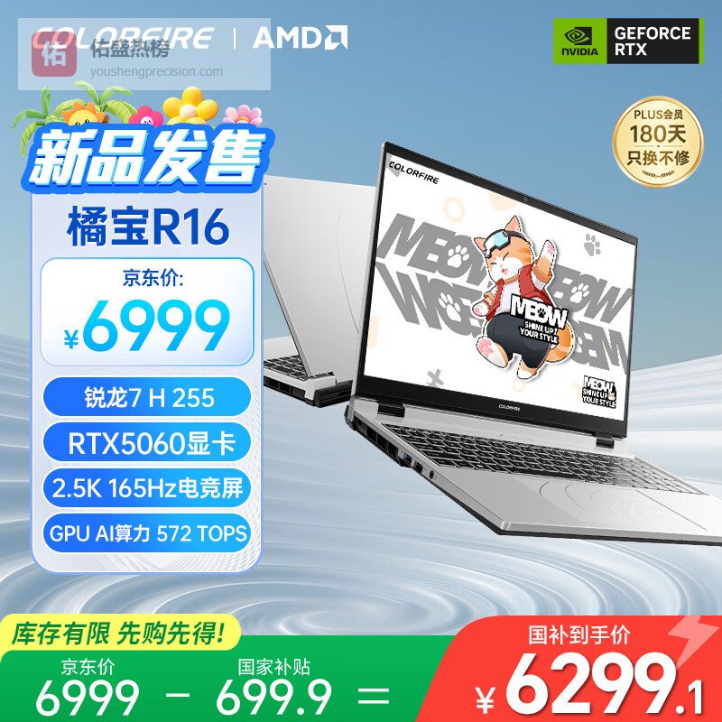 COLORFIRE MEOW 橘宝R16 七彩虹2025游戏笔记本电脑 锐龙7 H 255 16G 512G RTX5060¥