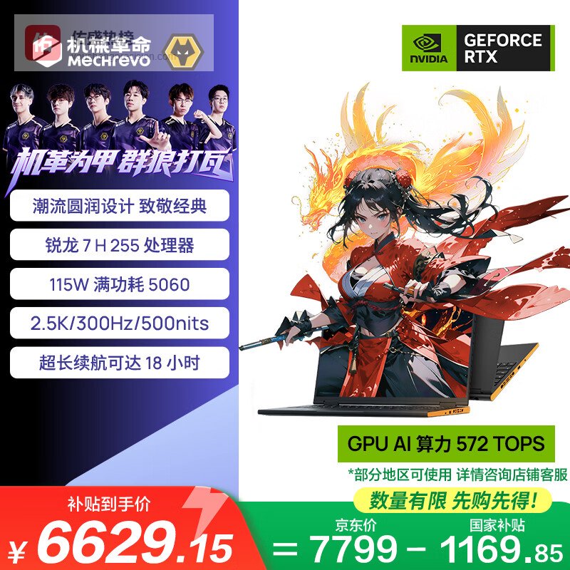 机械革命【国家补贴】翼龙16X 16英寸 游戏笔记本电脑(R7 H 255 32G 1T RTX5060 2.5K 300HZ 黑)¥