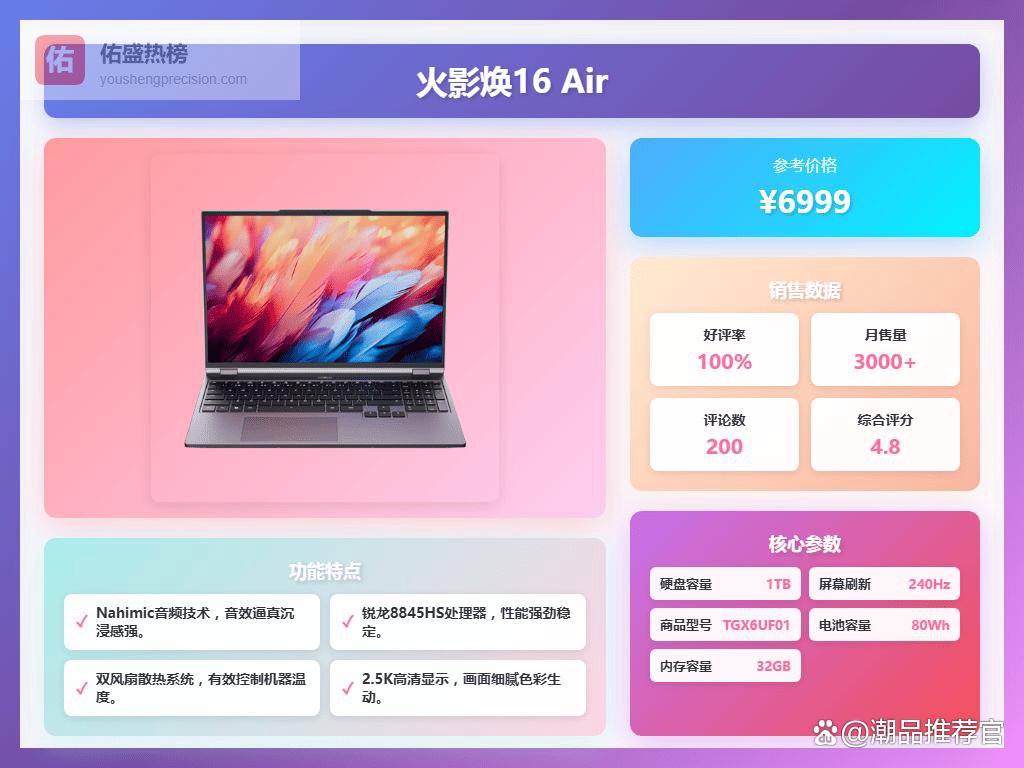 推荐理由:这款火影焕16 Air搭载高分辨率(2K以上)的IPS显示屏,240Hz刷新率让游戏画面流畅顺滑,色彩还原100%sRGB,支持10bit HDR,享受画面细节清晰丰富的视觉体验。它配备AMD锐龙7 8845H(S)八核处理器,最高频率达5.1GHz,性能足够应对各种大型游戏和多任务处理,非常给力。