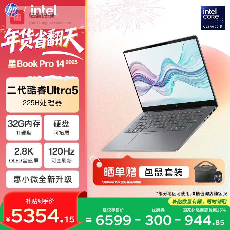惠普HP【国家补贴】星Book Pro 14 2025 轻薄笔记本电脑(酷睿Ultra5 225H 32G 1T 2.8K 120Hz AI)灰¥