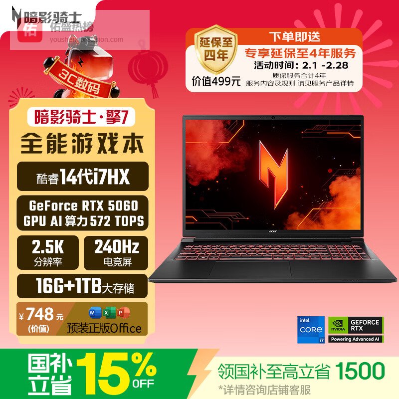 宏碁(acer)暗影骑士擎7 国家补贴 16英寸游戏本 笔记本电脑酷睿14代i7-14650HX 16G 1TB 2.5K 240Hz RTX5060¥