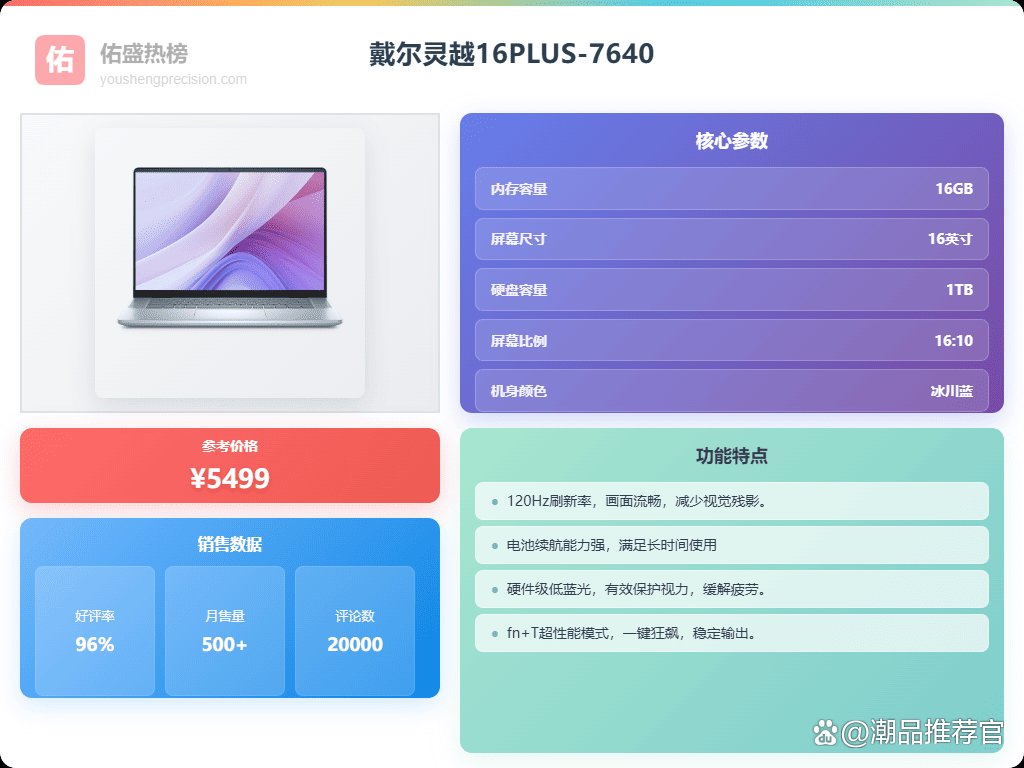 推荐理由:这款戴尔灵越16PLUS-7640的屏幕采用2.5K超清分辨率,画面显示非常细腻,色彩也很丰富,特别适合平时喜欢看电影或做设计的朋友。120Hz的刷新率让画面变得流畅,玩游戏或者浏览网页都特别顺滑,眼睛也不容易疲劳。