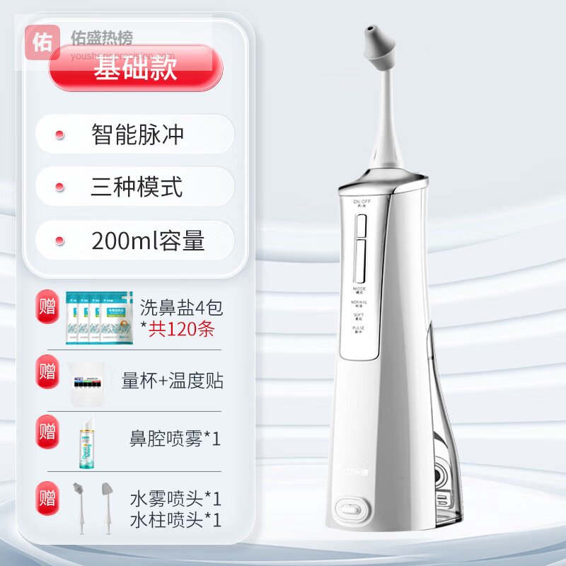 ⚠️ 关键细节 • 配套120包定量盐粉,避免自行调配浓度误差 • 可拆卸喷头配有紫外线消毒仓,杜绝二次污染 • 孕妇哺乳期适用,孕期鼻塞救星