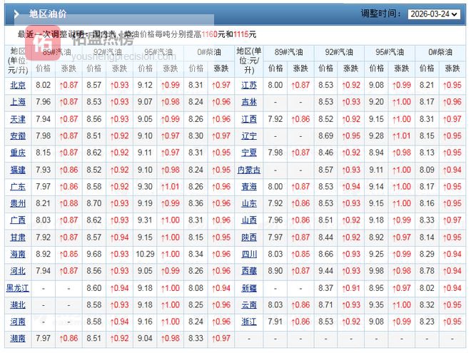 时光定了,下周,油价或上涨!按照汽柴油调价机制,基于上次汽柴油3月23日24时调整,国内92/95号汽油,油价上调0.93元以及0.99元/升,各地成品油延续今年单次最大上涨后的水平执行!不过,此番油价大涨落地后,下一次调价时间确定,4月7日24时准时调价,距离本次调整还剩8天时间,新周期结束50%,市场彻底反转,油价从下降转向上涨,2026年第7次调价,国内成品油或继续上涨!具体分析如下: