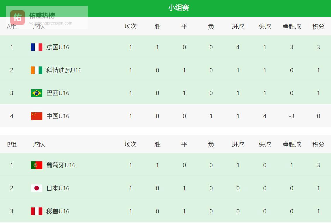 A组B组积分排名A组的情况是,法国队拿了3分,暂时排在第一位;巴西队和科特迪瓦队都是1分,并列第二;中国队0分,暂时垫底。