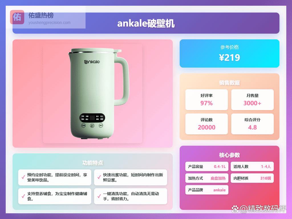 二、ankale参数:预约定时、营养辅食、快速出浆、外塑内钢杯体、不锈钢加热杯、316不锈钢内胆、12小时预约功能、六重降噪设计、保温6小时、触控操作