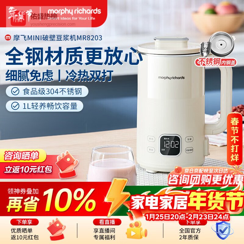 摩飞电器(Morphyrichards)破壁机豆浆机家用1L大容量低音全自动五谷杂粮免煮1-3人细腻免滤预约辅食机多功能料理机MR8203白¥